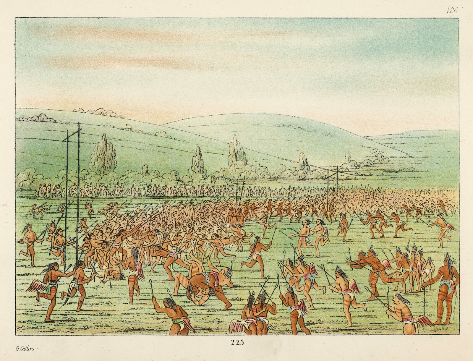 Traditional Tribal lacrosse games were sometimes major events that could last several days. As many as one thousand men from opposing Tribes could participate, the games were played on open plains between two villages, and the goals could range from 450 metres to several kilometres apart.